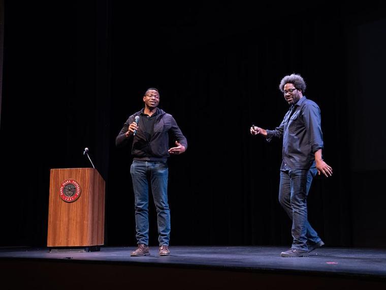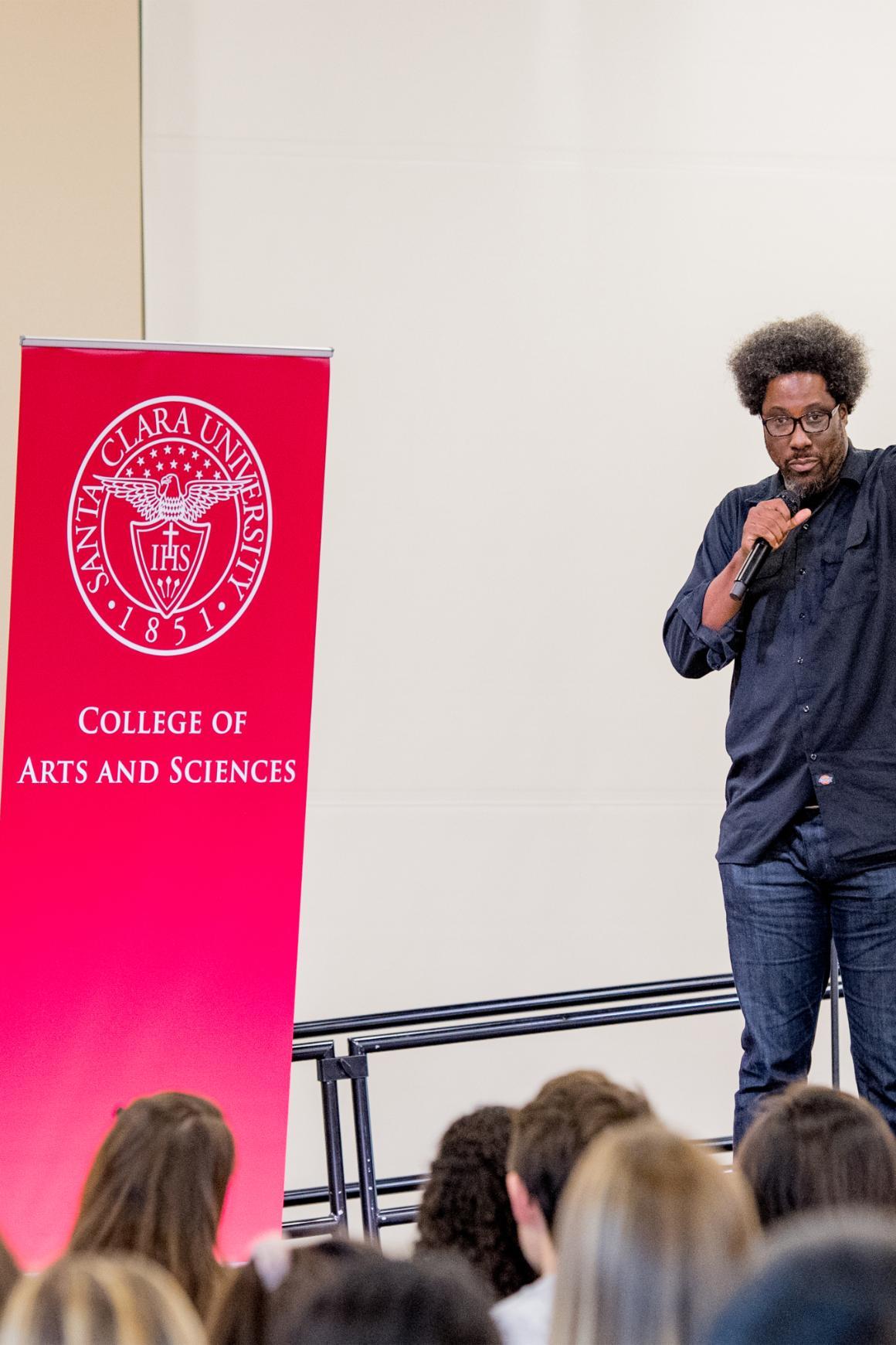 W. Kamau Bell completed his visits to campus on May 24, 2018, and left a legacy of reflection, learning, understanding of how to build empathy and reconciliation through dialogue and yes, humor. The Emmy-winning stand-up comedian, author, and CNN host offered incisive and scathingly funny commentary on modern society that helped change views on race, politics, identity and social issues in the United States. Joined by his spouse, Dr. Melissa Bell, SCU '01, Sinatra Faculty Fellow Danielle Morgan, Sinatra Student Fellow Julia Joyce and comics, academics, and thought-provoking guests, Mr. Bell visited classes, offer workshops for students, faculty, and staff, and entertained and informed the campus and Silicon Valley community.