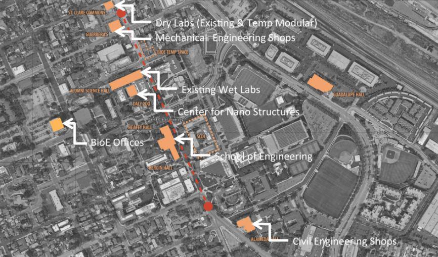 Recent major construction on campus has freed up a number of spaces for engineering’s departments and programs, and great care has been taken to match the physical characteristics of temporary and permanent space to best align with program needs (i.e., high bay space for civil engineering, ample shop space for mechanical engineering, etc.). The result: a string of engineering surge spaces located in a corridor along The Alameda between Park and Fremont Streets, running right through the center of campus. This linear grouping will ease students' transition between classes and make wayfinding user-friendly for faculty and visitors, as well.