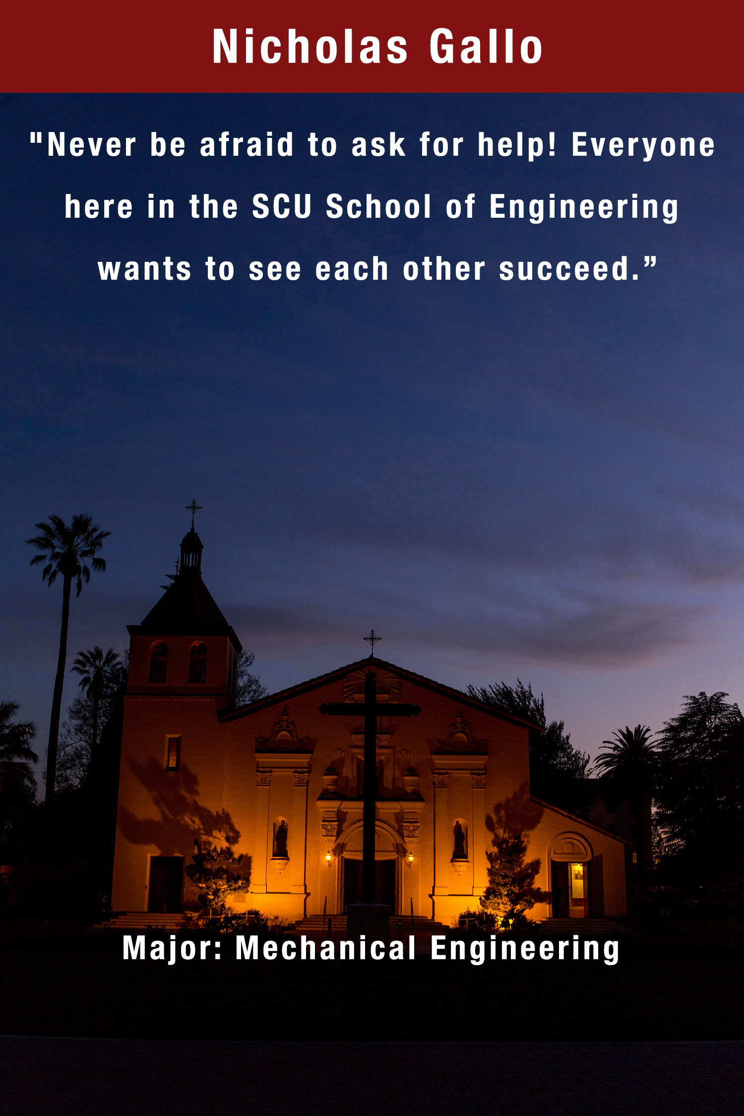 Our peer advisors are returning undergraduate students representing many of the degree programs in the School of Engineering. Each Peer Advisor is currently an upper division student who is heavily involved at the School of Engineering, through research and student organizations. They are eager to assist our new students and share their knowledge of Santa Clara University academic requirements, campus resources, and engineering opportunities!