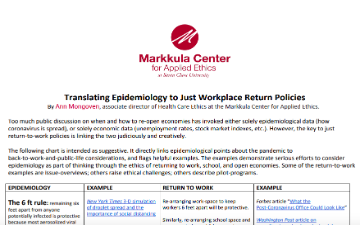 The following chart is intended as suggestive. It directly links epidemiological points about the pandemic to back-to-work-and-public-life considerations, and flags helpful examples. The examples demonstrate serious efforts to consider epidemiology as part of thinking through the ethics of returning to work, school, and open economies. Some of the return-to-work examples are issue-overviews; others raise ethical challenges; others describe pilot-programs.