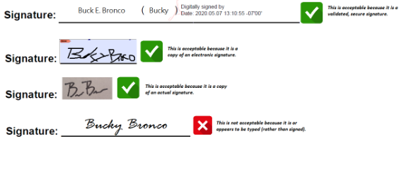 If you opt for the electronic signature, the signature must have a verification mark or be a signature. Typed signatures or signatures with a typed appearance are not accepted. Programs such as DocuSign or Adobe Sign have signature verification features. Please see below for an example.