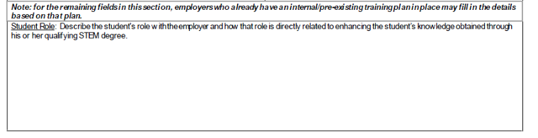 Questions to consider: What are the student's job responsibilities, duties and tasks? How will these change over the 24 month training period? How do the student's job responsibilities, duties and tasks expand and enhance the knowledge gained in the student's STEM degree program? How does the student's specific learning goals and educational objectives align with the student's day-to-day tasks?