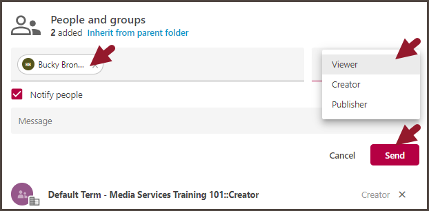 - Under the People and Groups section: Type in the person's SCU ID or Full Name if you know they have an active SCU Panopto account. You can also type in Email Address for people who do not have an active SCU Panopto account, or are outside of SCU community. You can also adjust a person's access to creator (can upload video) or publisher (can approve pending videos). Enter custom messages if desired, then click Send.
