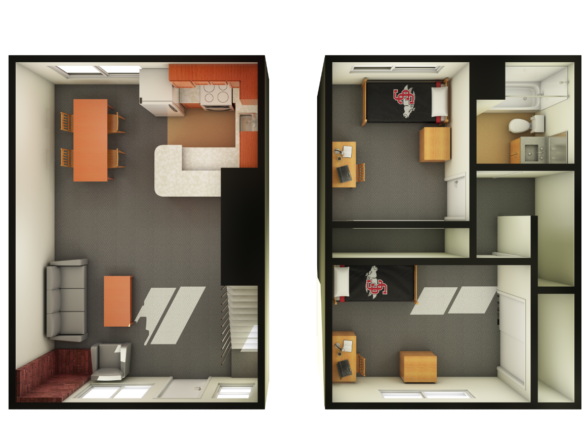 The Park Avenue Apartments are located in a residential neighborhood just one block from the south end of campus, off of Park Avenue. This garden complex consists of 20 two-story, two bedroom, one bath townhouses. Two students are assigned to each townhouse; each student is assigned an individual room. The townhouses are fully furnished and have more than 900 square feet of living space with a small front entrance private patio. The complex features a coin operated laundry facility, on-site parking and a comfortable community atmosphere. The ground floor living room and both upstairs bedrooms are wired for cable television and data networking. All utilities, cable television and access to the university’s high-speed network services are included in the lease and is billed per academic term.