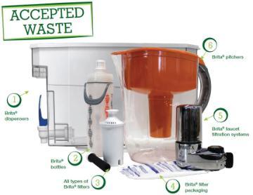 Recycle Brita pitchers, dispensers, bottles, faucet systems, all filters, and filter packaging as part of the Brita Brigade.